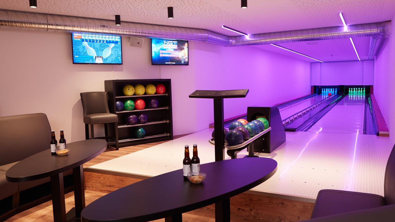 Eine Bowlingbahn besteht aus mehreren Bahnen, auf denen Spieler eine Kugel auf eine Formation von 10 Pins am Ende der Bahn werfen, mit dem Ziel, so viele Pins wie möglich umzuwerfen, ähnlich wie beim Kegeln. Mit moderner Technologie ausgestattet, bietet die Bowlingbahn in Obertauern, im Appartementhotel Glöcknerin, zudem automatische Punktewertung und atmosphärische Beleuchtung, die das Spielerlebnis noch unterhaltsamer macht. Nachdem der Boden für den „Anlauf" und auch die Bahn selbst mit einer speziellen Beschichtung überzogen ist, dass die Kugeln den Boden nicht beschädigen und besser rollen bzw. Rutschen, müssen eigene Bowlingschuhe angezogen werden. Natürlich bietet das 4 Sterne Appartementhotel Glöcknerin eine ausreichende Anzahl an Schuhen in verschiedenen Größen zum Leihen. Getränke und kleinere Snacks dürfen mitgebracht oder an der Bar geholt werden.